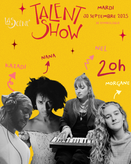 Réservation : https://www.billetweb.fr/talent-show-10 20h00 – Nel Nel est une jeune chanteuse et auteure-compositrice originaire d’Arlon. Ses chansons pop en français sont profondément marquées par les cinq années passées à Bruxelles, une période qui a façonné sa musique et sa personnalité. Avec des textes directs et sincères, elle vous embarque dans son univers intime. Son premier single “Roseaux” donne le ton d’un EP à venir, qu’elle développe en indépendant. 20h30 – Morgane Morgane explore les thèmes tabous à travers une pop française authentique, enrichie de sonorités néerlandaises. Sa musique crée des espaces de vérité où chaque chanson invite à la réflexion et à l’émotion. Une artiste qui confronte autant qu’elle rassemble, offrant une expérience musicale à la fois profonde et sincère. 21h00 – Kazadi Kazadi, surnommé “le médecin du cœur”, puise son inspiration dans l’amour et tout ce qui s’y rapporte. Ses morceaux afro, riches en mélodies envoûtantes, racontent des histoires universelles capables de toucher et de guérir les cœurs. Originaire du Congo et installé en Belgique, il mêle ses racines et son vécu pour créer une musique authentique et émotive, capable d’apporter réconfort et connexion à travers chaque note. 21h30 – Nana Projet Mosaïque Kintsugi, Nana est une artiste hybride au croisement du slam, de la musique, de l’acting et du mouvement. Belge et américaine, elle explore la renaissance à travers son art : laisser mourir ce qui ne nous convient plus et se reconstruire. Une performance sensorielle et introspective qui invite à la transformation et à la résilience.